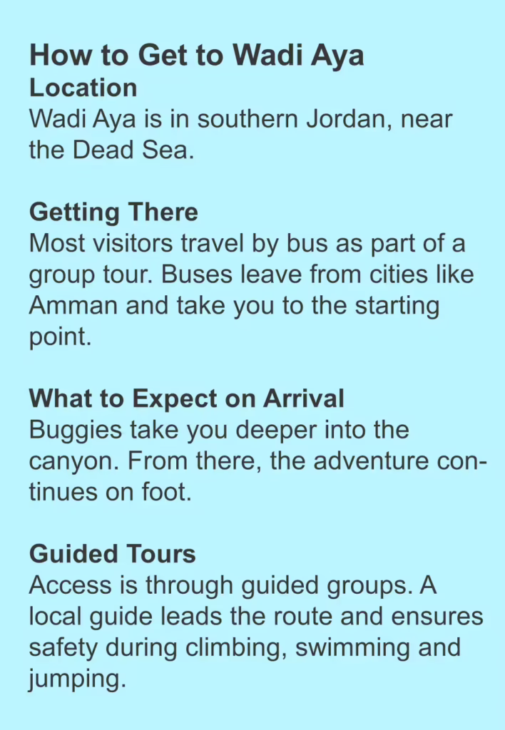 Hidden in southern Jordan, Wadi Aya is not just about viewpoints. It is about the adrenaline-filled journey. From the moment you enter the canyon, you are no longer just walking. You are climbing, swimming and jumping your way through it.